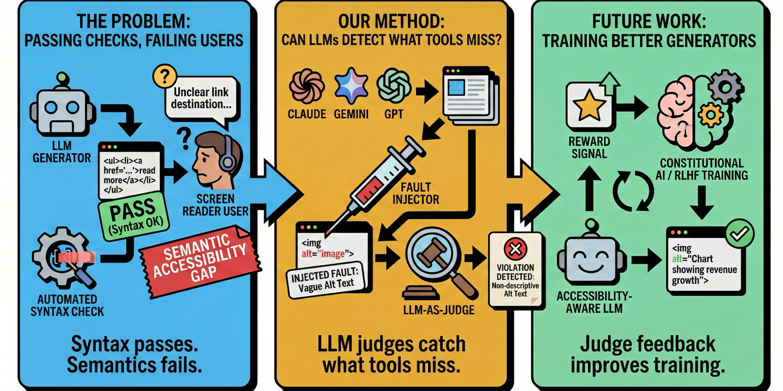 Measuring semantic accessibility violations that automated tools miss in LLM-generated web interfaces, using an LLM-as-judge approach.